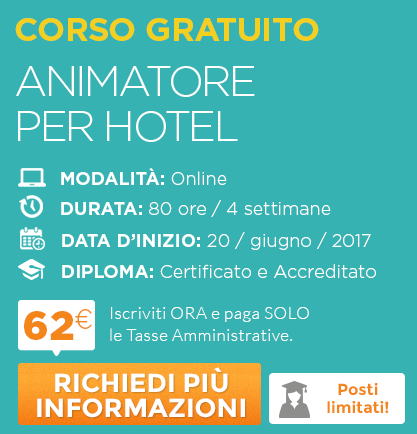 Il corso che presentiamo di Animatore per Hotel offre una serie di elementi concettuali, metodologici e pratici che permettono la creazione e l’esecuzione di attività di animazione attrattive, che si adattino alle necessità delle diverse tipologie di turisti.
