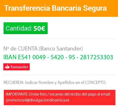 IMPORTANTE: Para los pagos mediante Transferencia o Ingreso RECUERDA indicar Nombre y Apellidos en el Concepto y enviar foto / escaneo del recibo a: promotora4@divulgaciondinamica.es