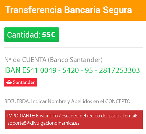 RECUERDA indicar Nombre y Apellidos en el Concepto y enviar foto / escaneo del recibo a: soporte8@divulgaciondinamica.es